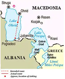 Lake Ohrid is the deepest lake in the Balkans, with maximum depth of 288 metres (945 ft).[5] The Ilinden boat was taking tourists to the Saint Naum Monastery. The boat, built in 1924,[6] had a maximum capacity of 45 passengers.[1] It sank within four minutes, some 200 metres (700 ft) from the shore, in shallow waters. The boat is said to have sunk around 11:00 AM local time,[1] in the vicinity of the Elešec camping site. Two other boats, the Alexandria and the Kristina, were nearby and were able to assist the passengers of the Ilinden. Most of the tourists on board were senior citizens, many of whom were unable to swim. Victims were from Pirdop, Zlatitsa, Chelopech and particularly Anton.[7]