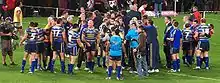Leeds Rhinos leave the pitch victorious after progressing to the Superleague Grand Final.