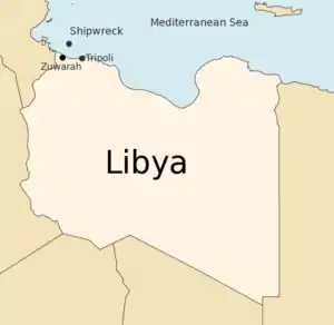 One vessel was confirmed by Libyan authorities to have capsized. It was a wooden fishing boat with a legal capacity of 50 persons and was attempting a crossing from Libya to Italy while carrying around 250 migrants.[1] The boat set off from Sidi Bilal, near Tripoli, where survivors have said that it was already in a poor condition and possibly holed.[1][2] The vessel is thought to have capsized 30 miles (48 km) off the Libyan coast on 27 March 2009 in high winds and seas.[1] A search and rescue attempt was made on 29 March by the Libyan Navy, Italian Navy and local fishing boats, which recovered 21 people alive from the upturned boat and a further 23 bodies.[1][3] At least 10 Egyptians and 10 Gambians were among the dead, along with Tunisians, Palestinians and Nigerians.[2][4][5] Those rescued were returned to Tripoli and 17 were admitted to hospital for treatment.[1] A further 77 bodies washed ashore on beaches to the west of Tripoli, including at Sebrata, on 31 March, the same day that search and rescue efforts were called off and the Libyan authorities made the news public.[1][3][6] The remaining passengers were listed as missing, presumed dead.[1]