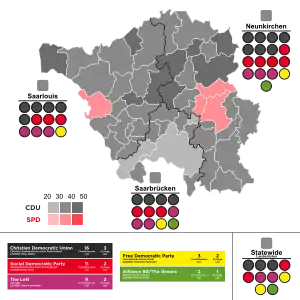 All 51 seats in the Landtag of Saarland 26 seats needed for a majority | ||||||||||||||||||||||||||||||||||||||||||||||||||||||||||||||||||||