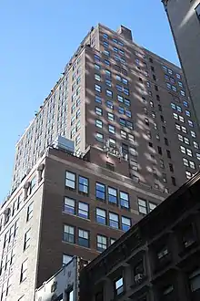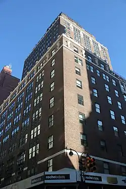 There is a setback on the eastern elevation above the ninth story, measuring 45 ft (14 m) deep. Behind this setback, the building tapers into a narrower tower.[8][9] This is because the eastern portion of the site was formerly zoned to allow only residential use, while the western portion could also accommodate commercial use. To comply with the zoning restrictions, the offices were above the ninth story, as the upper floors occupied only the western part of the site.[10] The lowest nine stories (which occupied the whole site) were originally an apartment hotel.[10][11] The northern and southern elevations contain a setback above the eleventh or twelfth story.[12][13] The restriction on the Madison Avenue portion of the site expired in 1940.[14][15]