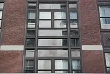 The upper stories contain a facade of red brick with limestone trim. The Madison Avenue elevation of the facade is made almost entirely of brick, except at several places where there is limestone trim. On the 35th and 36th Street elevations, only the outermost bays of windows are made of brick. The remaining bays are separated horizontally by brick piers; within each bay, the windows on different floors are separated horizontally by black spandrels. The spandrels on the second and third stories are made of ornamental ironwork, splitting each bay into multi-part windows. The spandrels on higher stories are made of dull black terracotta and divide each bay into three windows.[4]