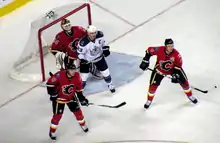 Calgary ended 2010 with three consecutive wins and won their first game in 2011 for a season-high four-game winning streak.[28] The streak came to an end at the hands of the New York Islanders on January 3, a contest that marked the Flames franchise's 3,000th game in its history.[29] Losses to Vancouver, Detroit and Carolina followed, the latter two in overtime, but the Flames' four-game eastern road trip that began in Carolina ended with the team registering two wins and six points. The last game of the trip, against the Montreal Canadiens, saw the team come back from a 4–0 deficit to force the contest into overtime before Montreal prevailed.[30] Kiprusoff struggled throughout the road trip, and was jeered by the fans on the team's first game home, a 6–0 loss to Minnesota.[31]