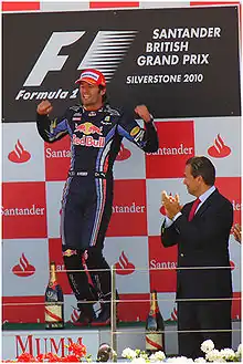 The 2010 British Grand Prix (formally the 2010 Formula 1 Santander British Grand Prix) was the tenth race of the 2010 Formula One season. On 7 December 2009, it was confirmed that the race would take place at Silverstone for the next seventeen years after the failure of Donington Park to raise the necessary funds to hold the race.[3] The event was staged on 11 July, the same day as the 2010 FIFA World Cup final (as also happened in 1990 and 1998).[4] The race was won by Red Bull driver Mark Webber, taking his third victory of the season.[5]