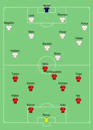 The first leg of the finals was seen by 49,500 spectators although they weren't all seated by the time Baldassi blew his whistle.[5] The first 15 minutes started with Internacional dominating the match, as Chivas struggled to create any rhythm.[5] Chivas subsequently started to settle into their play and knocked the ball around fluently, but struggled to find an entrance against a dogged Colorado backline.[5] The away side on the other hand continued to threaten out wide, and came close to scoring on the half-hour when Taison was pulled down on the edge of the area.[5] Alecsandro's kicked a free kick that saw the ball hit the bar and bounce out of play.[5] The Mexicans did manage to test Renan for the first time shortly after, the Internacional keeper reacting smartly to cut off Omar Bravo when the striker was played through behind the defence.[5] The Colorados suffered a setback when striker and top scorer Alecsandro hobbled off injured to be replaced by Everton, but the Porto Alegre outfit continued looking the more dangerous team.[5] With the last touch of the half however, Chivas struck against the run of play.[5] The Mexican midfield combined smartly on the edge of the area to release Marco Fabián, and his chipped pass found Adolfo Bautista; the midfielder looped a header in from outside the area, leaving the Inter keeper scrambling back in vain.[5]