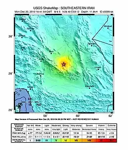 The 2010 Hosseinabad earthquake occurred on December 20 at 22:11 local time (18:41 UTC) with a moment magnitude of 6.6 and a maximum Mercalli intensity of VIII (Severe). It was located about 20 km from Hosseinabad (spelled variously as Ḩoseynābād or Hosein Abad) (Persian: حسين آباد), Kermān Province in south-eastern Iran, about 100 km from Bam.[2][3]
