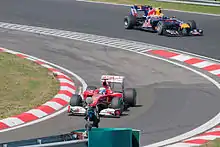 The 2010 Hungarian Grand Prix (formally the Formula 1 Eni Magyar Nagydíj 2010)[2] was the twelfth round of the 2010 Formula One season. It was held in Hungaroring, Hungary on 1 August 2010.[3] Red Bull driver Mark Webber claimed his fourth victory of the season, and reclaimed the championship lead after Lewis Hamilton's retirement from the race.[4] Pedro de la Rosa scored his last World Championship points at this race.