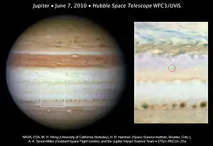 The 2010 Jupiter impact event was a bolide impact event on Jupiter by an object estimated to be about 8–13 metres (26–43 ft) in diameter.[1] The impactor may have been an asteroid, comet, centaur, extinct comet, or temporary satellite capture.
