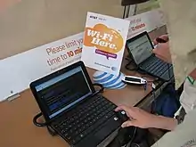 There was a focus on social networking at this jamboree which was entirely new. Generally, Scouts are instructed to leave their electronics at home when on camping trips, but this event was an exception. AT&T, one of the corporate sponsors, provided excellent cell phone coverage and a Wi-Fi network which spanned the entire site. This effected "a better signal in [the jamboree site] than in most residential areas."[6] AT&T also provided netbooks and cell phones for use by the Scouts in their Connection Centers, located throughout the site. There were also secure device charging lockers next to each connection center where phones or other devices could be recharged, although this set-up became controversial after Scouts began keeping the keys to the lockers in order to have a personal charging station. The jamboree trading posts sponsored competitions for videos and pictures submitted by participants. Staff members and signs placed around the site encouraged Scouts to tell about their experiences on various social websites. This allowed parents, siblings, and friends at home to get in on the action and see what was happening. Overall, the event was covered extensively on the internet as well as in local and national news.