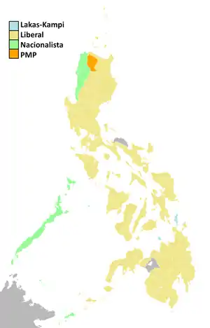 CongressSenate![]() Parties that had the plurality of votes in each province. ![]() Representation of results; seats contested are inside the box. Lakas-Kampi Liberal Party Nacionalista Party NPC PMP LDP PRP Independent Vacancy One-half of the Philippine Senate was up for election. The Philippines uses the plurality-at-large voting system for the Senate race.