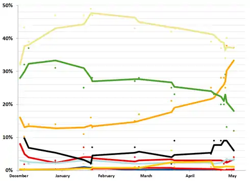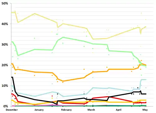 - May 3 - Manila Standard Today Presidential Survey: Aquino leads with Estrada overtaking Villar. [69]