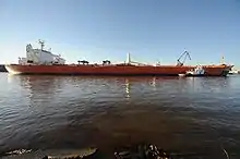A perimeter was established around the affected area, and none of the oil had harmed local wildlife.[4] The collision occurred in a still part of the channel, which helped to limit the flow of oil both upstream or downstream. AET activated their OPA 90 response plan and called upon Resolve Marine to lighter and refloat the damaged vessel while contractors worked to contain the oil spilled.[6] While the section of the waterway the collision occurred in is largely industrial, there are marshes along shorelines in other parts that are susceptible to damage from oil spills.[7] The collision closed the Port Arthur waterway, and Coast Guard personnel couldn't immediately comment on how long it would take to clean the spill or reopen the channel. The only statement made regarding the time it would take to reopen the waterway was that "We're working as quickly as possible to clean up the spill," according to a Coast Guard officer.[3] By the day after the incident, about 1,100 barrels (170 m3) of spilled oil had been recovered, and most of the unrecovered oil was contained. However, according to both the Coast Guard and local officials, the possibility of currents in the channel picking up remained, and with it the potential for oil to flow downstream into marshes.[8] Four oil refineries operate in the Port Arthur area, with a total capacity of about 1.1 million barrels (170,000 m3) of oil a day. In statements, neither Exxon or Valero, which operate two of the refineries, said they expected operations to be disrupted by the collision. Neither Motiva Enterprises or Total, which operate the other two refineries, initially publicly responded to the spill.[4] In its response to the incident, the tanker's operator, AET Inc. said it was cooperating with investigators, and was prepared to bear the costs of cleanup, but noted that responsibility for the incident had not been determined. The company also refused to name the pilots in charge of the ship at the time of the collision.[8] On January 27, the tanker was removed from the waterway, and soon after, limited traffic through the channel was allowed to resume. In a statement on January 29, the Coast Guard said they hoped to allow full operations in the waterway to resume within a week.[9]