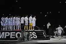 Real Madrid clinched a spot in the Champions League knockout phase on 2 November when they defeated Lyon away 0–2.[147] Ronaldo scored both goals to reach 100 competitive goals for Real Madrid in 105 matches.[148] He beat Lloris with a powerful free kick in the first half,[149] which was Real Madrid's 900th goal in European competition,[150] and a penalty kick in the second half.[151] Four days later, Real Madrid defeated Osasuna 7–1 in their first ever noon kickoff,[152] scheduled to cater to Asian audiences.[153] Sixty million people watched the match from China as a result.[154] Prior to kickoff, Ronaldo presented his 2010–11 European Golden Shoe award[155] and the team supported former player Antonio Cassano, who recently suffered a stroke and underwent heart surgery,[156] by wearing "Forza Cassano" shirts.[157] Ronaldo scored his fourth hat-trick in La Liga,[158] Benzema netted two goals,[159] and Pepe and Higuaín scored one each in the victory.[160] Di María served three assists in the first half before tearing his hamstring early in the second half,[161] and Şahin made his Real Madrid debut as a substitute following six months of injury.[162] Real Madrid defeated Valencia away 2–3 on 19 November for their 11th consecutive victory, the longest in Mourinho's managerial career.[163] Nicolás Terol, champion of the 2011 Grand Prix motorcycle racing season 125cc class, ceremonially kicked off the match.[164] Benzema opened the scoring in the first half from a quickly taken Alonso free kick,[165] and Sergio Ramos doubled the lead from a corner in the second half.[166] Roberto Soldado pulled a goal back for Valencia before Ronaldo avoided onrushing goalkeeper Diego Alves to restore a two-goal advantage.[167] Soldado scored again four minutes later,[168] but Valencia had an appeal for a handball in the penalty area turned down in stoppage time.[169] Three days later Real Madrid defeated Dinamo Zagreb 6–2[170] in their 1,500th official match at the Santiago Bernabéu[171] to clinch top spot in their Champions League group.[172] Despite resting Ronaldo, Iker Casillas and Pepe,[173] Real Madrid scored four goals in the opening 20 minutes through Benzema, Callejón, Özil and Higuaín.[174] Callejón and Benzema scored again after halftime before Fatos Bećiraj and Ivan Tomečak added late consolation goals.[175] The win was also their 250th in UEFA competitions.[176] On 26 November, Real Madrid stretched their unbeaten streak against Atlético Madrid to 22 matches after a 4–1 home victory in the Madrid Derby.[177] Prior to kickoff, Casillas was presented with a commemorative ball by Florentino Pérez for recently becoming the most capped Spanish international of all time.[178] Atlético struck first through Adrián,[179] but shortly afterward goalkeeper Thibaut Courtois was sent off while conceding a penalty,[180] converted by Ronaldo.[181] Di María finished a low cross from Ronaldo early in the second half,[182] and then Higuaín extended the lead by capitalizing on a defensive error from Diego Godín.[183] Godín was later sent off for denying Higuaín a clear goalscoring opportunity in the box and Ronaldo converted another penalty.[184] The victory coupled with Barcelona's loss at Gefate boosted Real Madrid's lead in La Liga to six points.[185] Real Madrid were again recognized by IFFHS as The World's Club Team of the Month after completing November with all victories.[146]
