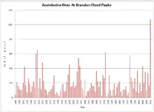 Downstream of Brandon, the Manitoba Government forecast that between 54000-56000 cu ft/s of water would enter into the Portage Diversion reservoir near Portage la Prairie.[8] The capacity for the Portage Diversion channel, which drains into Lake Manitoba, is only approximately 25,000 cu ft/s (710 m3/s), which would mean that between 29000-31000 cu ft/s of water would flow toward communities such as Poplar Point, St. Francois Xavier, and Headingley, before joining with the Red River at The Forks.[9] This amount of water would overwhelm the dikes downstream, along the Assiniboine River, which were only built to allow for a channel capacity of about 10,000-11,000 cu ft/s before spilling over. Otherwise breaching of dikes would occur.[8]
