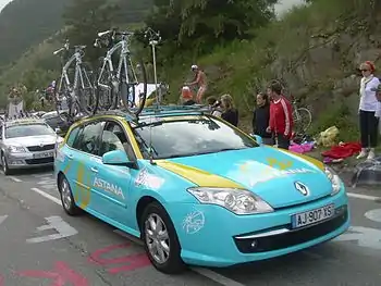 Later in April, the team took two wins at two concurrent events. In stage 2 at the Presidential Cycling Tour of Turkey, Valentin took his first win of the season in a field sprint, besting Alessandro Petacchi at the finish. The victory made the younger Iglinsky the race leader for a day before he ceded it to Colnago–CSF Inox's Manuel Belletti, winner of stage 3.[33][34] Later in the race, Zeits made a fortunate breakaway which took nearly 12 minutes over the rest of the peloton. The result put him fourth in the overall standings, 20 seconds clear of the man in fifth, but 10 minutes ahead of the man in sixth.[35] The next day, the Astana squad worked hard to get another breakaway containing Zeits to the finish line first, which resulted him in moving up to second overall.[36] He retained this position to the conclusion of the race.[37] At the Tour de Romandie, Vinokourov won stage 3. He, Mikaël Cherel, and Tony Martin had slipped off the front of the field when the day's principal breakaway was caught, and stayed away to allow a three-up sprint decide the winner, though they had no appreciable time gap over the fast-charging peloton at the finish. Cherel protested the results, feeling that Vinokourov's sprint had illegally impeded him, but race officials upheld the order of finish on the road. Vinokourov felt after this result that he was a strong contender for the overall crown, sitting 32 seconds back with an individual time trial, where pending race leader Pavel Brutt struggles, still to race.[38] He finished the race third, losing time to race champion Cadel Evans in that time trial. He later said he was satisfied with this performance.[39] However, at this race, Kiserlovski was revealed to have worse injuries from his Paris–Nice crash than first thought. An MRI taken after the Romandie prologue, due to the Croatian suffering from severe shoulder pain, revealed that he had a cracked vertebra. He abandoned the race with hopes of recovering in time for the Giro d'Italia.[40] Vinokourov had a successful Critérium du Dauphiné. He finished second in the prologue time trial and assumed the race lead the next day on the first road race stage.[41][42] He held the jersey for a second day before losing it in the stage 3 time trial, a considerably longer course than the prologue. He finished a distant 14th, having difficulty on the technical descents on the course, and slipped to fourth overall.[43] When Janez Brajkovič faltered in stage 6, Vinokourov re-assumed a podium position, third, and kept it to the race's conclusion the next day.[44][45]