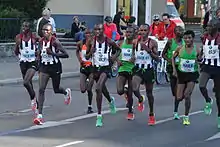 Prior to the race, the two favourites for the men's competition were Makau (the defending champion and then-fifth fastest ever) and the world record holder Haile Gebrselassie of Ethiopia – the race marked the first outing since Haile had declared retirement following a poor showing at the 2010 New York City Marathon.[1] There were a large group of pacemakers aiding the elite men for the first part of the race. The leading group, including the two favourites and three others (Edwin Kimaiyo, John Kyui and Emmanuel Samal), reached the halfway point in 61:44 minutes. Makau became the first runner to break away at the 26 km mark and he began zig-zagging along the course in the hope of disrupting Haile Gebrselassie, who followed. The tactic worked as the Ethiopian came to an abrupt halt, later dropping out entirely. Makau sped away unopposed and finished the race with a world record, beating his rival's former mark by 21 seconds. Behind him, Stephen Kwelio Chemlany, who started as a pacemaker, continued to the finish to take second place with a time of 2:07.55 hours and Kimaiyo was third to cross the line in 2:09:50 hours, making it a Kenyan podium sweep.[2][3]