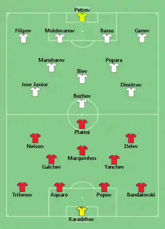 Hristov soccer ball with check mark, Bozhov soccer ball with check mark, Peev soccer ball with check mark, Mansharov soccer ball with check mark, Jose Junior soccer ball with check mark, Filipov soccer ball with check mark, Dimitrov soccer ball with red X, Moldovanov soccer ball with check mark