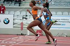 Jamile Samuel, the Netherlands (left), and Gloria Hooper, Italy (right), at the finish of the 4 × 100 m relay heat.