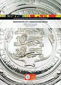 The 2011 FA Community Shield (also known as The FA Community Shield sponsored by McDonald's for sponsorship reasons) was the 89th FA Community Shield, an annual football match contested by the winners of the previous season's Premier League and FA Cup competitions. The match was the 160th Manchester derby between Manchester United and Manchester City and played at Wembley Stadium, London, on 7 August 2011.[3] Manchester United won the game 3–2, with goals from Chris Smalling and Nani (2), after Joleon Lescott and Edin Džeko had put City 2–0 up at half-time.[4]