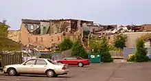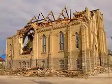 In the days following the storm, as power was restored, roads became passable, and damaged structures shored up, local public works crews established fencing and concrete barriers around the entire perimeter of historic downtown Goderich to prevent looting and trespassing. These measures were also enforced by the Ontario Provincial Police, who barred anyone other than those contracted for cleanup efforts to stay out of the area. By the end of August, the question of restoration of many of the oldest structures in Goderich was one of major debate.[17] The town square was finally reopened on Friday, September 9.[18] However, several of the historic structures (including the opera house on Kingston Street, the church on Victoria Street, and a studio on Montreal Street) were all razed in October.[19] The recovery process is ongoing, and will take many months or potentially years to fully complete, amid significant controversy regarding insurance settlements for private property owners. The Insurance Bureau of Canada estimates the tornado caused $75 million in damage, but the Mayor of Goderich estimates the total bill will top $100 million.[1]