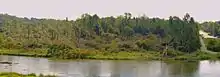 Crossing Kings Highway 21, the tornado moved into the easternmost residential areas of Goderich, north of Elgin Street. More homes sustained significant damage here, with most of those affected receiving some form of roof or window damage. Those with clapboard siding had pock marks and some of their paint stripped. Other homes lost vast portions of their roofs and commercial buildings near Oxford Street and Maitland Road had partial roof removal and exterior wall damage. Some of these walls partially collapsed, crushing more vehicles. Timber power poles were snapped, and concrete light posts were partially toppled near this location. Moving to the east-southeast, the tornado left Goderich, on its way toward the hamlet of Benmiller approximately 8 kilometres away. Now emerging from the rain curtains as a menacing, stovepipe-shaped funnel, and roughly following the Maitland River, the tornado's path widened.[14] In this mostly rural area, there was extensive tree damage in a swath about 1 kilometre wide. Passing through Benmiller it caused extensive damage to several more structures, including the Benmiller Inn. Large swaths of trees were downed on both sides of the Maitland River, as well as in town. Witnesses also reported that the tornado briefly reversed the river's flow as it approached (Cooper and Cove, 2011). Structural debris from Benmiller was deposited into the river, and the damage became more erratic as the tornado crossed uneven terrain; structures on higher ground were more severely damaged.