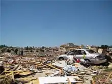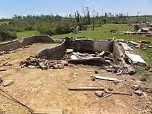 EF4 and EF5 damage continued as the tornado exited Phil Campbell and tore through rural areas, sweeping away additional homes as it roughly followed County Roads 81 and 82.[13] The tornado then reached its maximum intensity as it tore through the rural community of Oak Grove, with the damage intensity reaching well into the EF5 range and a path width over a mile wide. Oak Grove suffered a large swath of total devastation as large and well-built brick homes with extensive anchoring were swept completely away, with the debris strewn and wind-rowed long distances through nearby fields. A Corvette was thrown 641 feet (195 m) and severely mangled, and a vehicle missing from one residence was never found. A large metal chicken house completely vanished, with nothing recovered at the site but a single piece of metal truss, and numerous large trees in this area were completely debarked.[13] A total of 27 people were killed in Franklin County, mainly in and around Phil Campbell.[14] The tornado continued into Lawrence County and maintained EF5 strength as it struck the small town of Mount Hope, where significant devastation was incurred to single-family homes and a restaurant. Nothing but the foundation and a pile of debris remained at the restaurant site, and a small portion of the restaurant's foundation slab buckled. Thousands of hardwood and softwood trees were snapped, with a significant number of trees twisted and debarked with only stubs of branches remaining. Many mobile homes were also destroyed with the frames mangled, and a single-family home was completely destroyed, with the walls and contents strewn over a hundred yards.[13] WAAY-TV meteorologist and Mount Hope resident Gary Dobbs spotted the tornado from his front window but was unable to get to his storm shelter because he was giving a live report to viewers of WAAY. While the house was destroyed around him, Dobbs was thrown 40 feet (12 m) from his residence. The door of the storm shelter on the property was torn off, but no friends therein were seriously injured. Dobbs required hospitalization.[15][16]