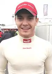 Palmer and his teammate Král had problematic pit stops and dropped out of the top ten.[23] Berthon was closing up to Turvey. when on lap 15 he came into contact with another car that blocked his attempt at overtaking and retired when he struck the barrier.[26] Later on, Valsecchi made a driving error that put him off the track at Acque Minerali corner and Coletti took fifth from him.[23] At the front, Grosjean increased his lead over van der Garde to 14.349 seconds and crossed the start/finish line after 35 scheduled laps to achieve his first victory of the season and his first in the GP2 Series since the 2009 Monaco round. Grosjean needed to finish fourth in the sprint race to win the Drivers' Championship.[24][25] Bianchi could not get near van der Garde and came third with Herck, Coletti and Leimer in positions four to six.[22] Clos gained 13 places from his starting position to finish seventh. Fauzy took eighth and the sprint race pole position after Valsecchi was disqualified due to his car failing a ride height test in post-race scrutineering.[22][27] The final classified finishers were González, Ericsson, Gutiérrez, Král, Varhaug, Turvey, Cecotto, Leal, Caldarelli, Palmer, Aleshin, Pic, Chilton and Filippi.[21]