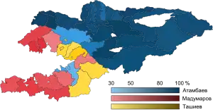 Former Prime Minister Atambayev won the presidential election by a large margin in the first round and became the new President of Kyrgyzstan.[2] Over 60% voter turnout was recorded.[12]