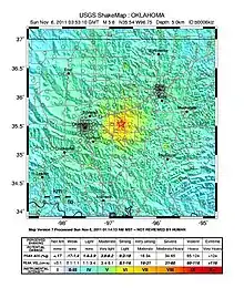 The 2011 Oklahoma earthquake was a 5.7 magnitude intraplate earthquake which occurred near Prague, Oklahoma on November 5 at 10:53 p.m. CDT (03:53 UTC November 6) in the U.S. state of Oklahoma.[3] The epicenter of the earthquake was in the vicinity of several active wastewater injection wells.[4][5] According to the United States Geological Survey (USGS), it was the most powerful earthquake ever recorded in Oklahoma; this record was surpassed by the 2016 Oklahoma earthquake.[3] The previous record was a 5.5 magnitude earthquake that struck near the town of El Reno in 1952.[6] The quake's epicenter was approximately 44 miles (71 km) east-northeast of Oklahoma City, near the town of Sparks and was felt in the neighboring states of Texas, Arkansas, Kansas and Missouri and even as far away as Tennessee and Wisconsin.[7] The quake followed several minor quakes earlier in the day, including a 4.7 magnitude foreshock.[7][8][9] The quake had a maximum perceived intensity of VIII (Severe) on the Mercalli intensity scale in the area closest to the epicenter.[2] Numerous aftershocks were detected after the main quake, with a few registering at 4.0 magnitude.[7]