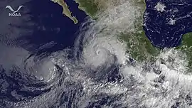 Tropical cyclone warnings and watches were also issued for portion of the coast. Large swells were also expected.[56] A red (emergency) alert was issued for parts of the coast. Officials urged residents to be prepared to evacuate. The port of Acapulco was closed for small craft. A moderate to high alert of rain and wind was noted.[57] The storm's outer bands produced heavy rainfall over Chiapas and Tabasco, with accumulations in Tabasco reaching 8.58 in (218 mm) in 24 hours.[58] Several rivers across the region overflowed their banks and flooded nearby areas. In Villahermosa, heavy rain collapsed drains and many streets were flooded. In addition, cars were stranded in floodwaters. Across Colima, waves reached 9 to 15 ft (2.7 to 4.6 m).[59]