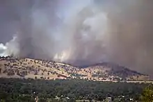 In the hours after midday the fire spotted across John Renshaw Parkway and breached the containment line, burning with flames of up to 33 m (108 ft) and impacting upon the Warrumbungle Visitors Centre, where a number of RFS and National Parks and Wildlife Service (NPWS) employees were sheltering. By mid-afternoon, the fire was spreading downwind at a rate of 3.7 km/h (2.3 mph) and the NSW Police commenced evacuations to the east of the fire, including at Siding Spring Observatory. The observatory was impacted by the fire in the late afternoon, causing the destruction of three buildings in the complex; 'The Lodge' accommodation used by visiting researchers, the Director's Cottage and the Fire Station.[46][47] Throughout the evening a 14 km (8.7 mi) high pyrocumulonimbus cloud formed above the blaze, creating unpredictable winds, intense spotting and other extreme meteorological conditions; the fire burned to the east, along Timor Rd., burning to within 13 km (8.1 mi) of Coonabarabran township.[19] A southerly wind change passed through the fire ground some time after 18:00 AEDT, causing hot ash and embers to fall in Baradine, 50 km (31 mi) north of Coonabarabran, throughout the night and prompting the Baradine local hospital to secure the windows with damp towels to prevent the entry of smoke and ash.[19]