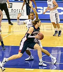 Before the 2012–13 season, the Gonzaga Bulldogs men's basketball team lost two seniors from the previous year to graduation: starter Robert Sacre and transfer Marquise Carter.[8] Sacre was the team's third-highest scorer, with an average of 11.6 points per game, and averages of 6.3 rebounds and 1.4 blocks per game.[9] In his final season, he was selected for the all-conference team[10] and finished his career with 1,270 points, 679 rebounds, and 186 blocks.[11] He would go on to be selected by the Los Angeles Lakers as the 60th overall pick in the second round of the 2012 NBA draft.[12] Carter was a guard off of the bench, and averaged 3.8 points, 1.5 rebounds, and 1.7 assists per game.[9]