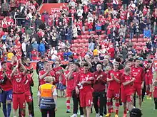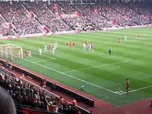 Southampton began their first top-flight campaign in seven years against reigning champions Manchester City and runners-up Manchester United, and picked up only four points from their opening ten games leaving them firmly at the bottom of the table.[26][27] In November and December the team's fortunes improved, and they picked up important wins over fellow strugglers to lift themselves out of the relegation zone.[28][29] After Christmas the Saints went on a six-game unbeaten run, and they later picked up high-profile wins against Manchester City, Liverpool and Chelsea to continue to move away from the drop zone. Survival in the Premier League was confirmed on 14 May when Wigan Athletic lost to Arsenal to take the final relegation place.[30] Southampton finished 14th in the table having won nine, drawn 14, and lost 15 of their 38 games, collecting 41 points in the process.[31]