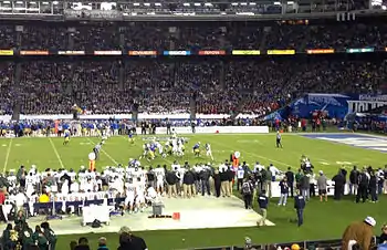The Bears and the Warhawks had never met prior to this Friday night game in the fourth week of the 2012 season.[6] In the preceding two weeks, the Warhawks had stunned the college football world by defeating then #8 Arkansas 34–31 in overtime and taking Auburn to overtime in a 31–28 loss at Auburn.[7][8] With excitement surrounding the Louisiana-Monroe program at an all-time high, the Bears traveled to Monroe to face the Warhawks in their home opener before a Malone Stadium-record crowd of 31,175. ULM struck first, capitalizing on two interceptions to take a 14–0 lead in the 1st quarter. Baylor outscored the Warhawks 34–14 in the next two quarters, and took a 34–28 lead into the fourth with ULM driving. The Warhawks would score on their drive spanning the third and fourth quarters to go ahead 35–34, but the Bears would answer with a 14-play, 73-yard drive of their own to go ahead 40–35 (a two-point conversion attempt failed). Baylor subsequently forced a fumble and drove down the field for another touchdown to make the score 47–35. ULM, fighting to the end, struck back to score a touchdown and pull within 5 points of Baylor; however, with only 6 seconds remaining, the subsequent onside kick was recovered by the Bears. The victory represented Baylor's ninth consecutive win, which at the time was the second-longest winning streak in the nation behind TCU. The game also represented the Bears' seventh consecutive game in which they scored more than 40 points.[9]