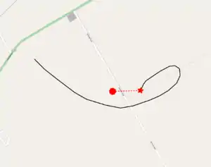Eyewitnesses saw the balloon climb and drift east towards a 10 m-high (33 ft) 33,000-volt power line running perpendicular to the road,[14][15] one of the two lines that connected the Clareville zone substation, which supplied Carterton and the surrounding rural area, to the national grid at Transpower's Masterton substation.[16] The pilot was heard shouting "duck down" as the balloon came in contact with the power line around 85 m (279 ft) from the road. One of the conductor wires was caught over the top of the pilot's end of the basket, and the pilot attempted to get the balloon to climb, but the tension of the wire prevented it rising and instead the balloon slid along the conductor. Around 20 seconds later, electrical arcing occurred as the balloon caused a phase-to-phase short circuit, tripping the line and causing the 3800 properties supplied by the Clareville zone substation to lose power.[1][9][17] The arcing caused one of the four liquefied petroleum gas bottles supplying the burners to rupture, and a fire subsequently started.[18]