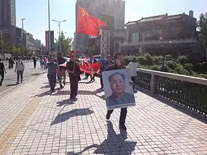 The anti-Japanese protests were occasionally exploited by protesters who sought to criticize the Chinese government. Such demonstrations included marching with posters of the late Chinese leader Mao Zedong—perceived to be more assertive on issues of sovereignty than current leaders, as well as signs about corruption, food safety, and income inequality.[24] Supporters of the ousted anti-capitalist leader Bo Xilai also had a showing during the protests.[25]