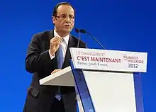 The 2011 French Socialist Party presidential primary was the first open primary (primaires citoyennes), jointly held by the French Socialist Party and Radical Party of the Left[6][7][8] for selecting their candidate for the 2012 presidential election. Voters had to donate at least one Euro and sign a pledge to the values of the Left to be eligible.[9][10] The filing deadline for primary nomination papers was fixed on 13 July 2011 and six candidates competed in the first round of the vote. On election day, 9 October 2011, no candidate won at least 50% of the vote therefore the two candidates with the most votes contested a runoff election on 16 October 2011: François Hollande won the primary, defeating Martine Aubry.[11] The idea for holding an open primary to choose the Socialist Party candidate was originally suggested in 2008 by the left-leaning think tank Terra Nova.[12]