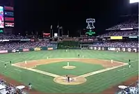 The Phillies were 36–45 and 11 games behind the first place Nationals after their series against the Marlins. The Phillies started the month by taking 1 of 3 from the New York Mets. The one win, however, came with Cliff Lee finally winning his first game of the season after 13 starts. The streak tied for 5th for the longest winless streak for a pitcher.[15] On July 6th, first baseman Ryan Howard was activated from the disabled list. The Phillies would end the first half by getting swept by the Atlanta Braves. They ended the first half with a disastrous 37–50 mark, their worst since 1997.[16] The Phillies seemed to have woken up in the second half, as they would take 2 of 3 from the Colorado Rockies and Los Angeles Dodgers. Although they only took 1 of 3 from the San Francisco Giants, they would make it up by sweeping the Milwaukee Brewers, all from late comebacks. The sweep was their first 3-game sweep of the year. The sweep, however, got taken back by the Braves as they would get swept by them again because they had a hard time with runners in scoring position. The sweep woke up the Phillies, as they would blow out the Washington Nationals in the 1st game of the series on July 31, 8–0. The Phillies would end up taking 2 of 3 from the Nationals. After the series against the Nationals on August 2, the Phillies were 47–58, 15 and a half games behind the first place Nationals, and 13 game behind the second wild card. Although their playoff chances are slim, the Phillies performance after the all-star break looked promising for next season. Throughout the month, knowing that they will likely not make the postseason, the Phillies made trades with some of their players. One of the trades were Hunter Pence getting traded to the Giants for Nate Schierholtz, Tommy Joseph, and Seth Rosin. Another trade was Shane Victorino getting trading to the Dodgers for 2 pitchers.[17] Pitcher Joe Blanton was also traded to the Dodgers.[18] The Phillies would also resign Cole Hamels to a six-year, $144 million extension, the second-largest contract for a pitcher in baseball history.[19]