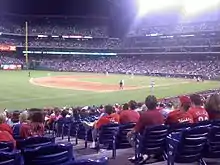 The Phillies next series against the Washington Nationals began in the offseason. Andrew Feffer, the Nationals chief operating officer, launched a campaign in the offseason for the first home series against the Phillies to "Take Back the Park." In prior years, Nationals Park has been taken over by Phillies fans who could not get tickets for a home game, and the crowd was at times made up of over 80% Phillies fans.[9] The park was publicly referred to by Phillies fans as "Citizens Bank Park South." To avoid this, Feffer allowed only those with Maryland, Virginia, or D.C. addressed credit cards to purchase tickets. Once the series came near, the Nationals released an official "Fans Guide to Natitude Weekend", which explained fans how to approach the series, and gave them guidelines on how to cheer for their home team. Once the series came, it was the Nationals who were in 1st place in the division, and the Phillies who were at the bottom. The first game of the series went into extra innings, with the Nationals taking game 1, 4–3. Charlie Manuel was ejected in the game in the 1st inning, it was his first ejection of the season.[10] The Nationals also took game two of the series by a score of 7–1. However, the Phillies took the third game by a convincing 9–3 victory. In the game, former Phillie Jayson Werth broke his wrist, and while leaving the field, was heckled by a couple of Phillies fans. Following the game in an email to The Washington Post, Werth wrote "I am motivated to get back quickly and see to it personally those people never walk down Broad Street in celebration again."[11] Despite an attempt to be shut out, many Phillies fans still made the trip to Washington, many of them sporting their "Occupy Nationals Park" T-shirts.[12]
