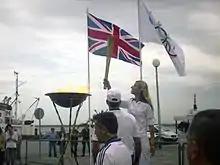 On water, the torch rode in a power boat in Bristol Harbour,[30][31] in an RNLI lifeboat along the Menai Strait,[32] by ferry on the Mersey Ferry,[33] and by the steamboat MV Tern across Windermere.[34][35] In unpowered watercraft, it was punted along the River Cam in Cambridge,[36] and rowed along the River Medway in Maidstone.[37] Its final journey to the Olympic Stadium on 27 July was by speedboat, piloted by footballer David Beckham along the River Thames.[38]