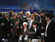 The emergence of two-term former president Ali Akbar Hashemi Rafsanjani and Ahmadinejad’s top aide, Esfandiar Rahim Mashaei, dramatically changed the landscape of an election that until recently most observers thought would be fought between conservative candidates loyal to Iran’s supreme leader, Ayatollah Ali Khamenei. Amid tight security, Rafsanjani made his way through the crowd to the registration center. As he arrived at the designated desk, it became clear that Mashaei, flanked by Ahmadinejad, was registering simultaneously just a few feet away.[7] "I came to serve. It is the right of the people to choose me or not.", Rafsanjani said. Rafsanjani endorsed the opposition Green Movement during the last election in 2009, when Mahmoud Ahmadinejad, the outgoing president, won a disputed contest.