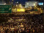The first large protest was held on June 6 on Paulista Avenue.[60] In ensuing protests, news reports changed the discourse, mentioning that police had "lost control" on June 13, because they began using rubber bullets not only against protesters but also journalists that were covering the events. Numerous civil rights groups have criticized the harsh police response, including Amnesty International[14] and the Associação Nacional de Jornais.[15]