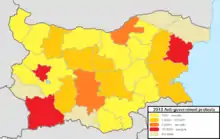 Electricity costs are one of the main expenditures for Bulgarian citizens.[29] Local analysts estimated that with rising living costs, almost 100 per cent of the average Bulgarian household's monthly income would be spent on utilities, food, transportation, healthcare and education.[36] Currently 85 per cent of household monthly incomes are spent on basic necessities.[36] Prices in Bulgaria amount to 49 per cent of the European Union average,[37] At the same time average salaries are the lowest among European Union members at 768 leva (393 euro) for September 2012.[38] The minimum wage is ten times lower than that of some member states,[39] amounting to 310 leva (159 euro), or about 1 euro per hour. Twenty-two per cent of the labour force are employed on a minimum wage.[40][41] For the past three years, incomes have marked almost no change, while prices have increased significantly.[36] Austerity measures encouraged by the European Union and the International Monetary Fund during the recession have resulted in "catastrophic" social consequences according to the International Trade Union Confederation.[2] The government of Boyko Borisov strictly imposed austerity measures and sustained fiscal stability, but also delayed government payments to private companies,[42] and was criticised for worsening corruption and media freedom[43] indicators, political authoritarianism and general economic stagnation.[4] As a consequence, the support for Borisov and his centre-right Citizens for European Development of Bulgaria (GERB) party has been steadily declining since 2010.[44] A major blow to GERB's popularity came after their decision to cancel the Belene Nuclear Power Plant project, which was believed to be a way to reduce electricity costs and create jobs.[45] Mass protests for political or social causes are relatively uncommon in Bulgaria, but have become more frequent since 2007, when the issue of the preservation of Strandzha Mountain nature areas came to the forefront.[46]