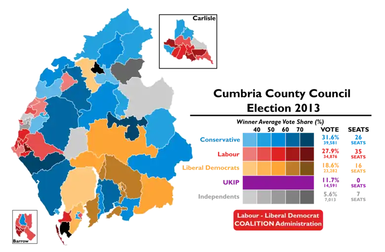![]() Map showing the results of the 2013 Cumbria County Council elections. | |||||||||||||||||
