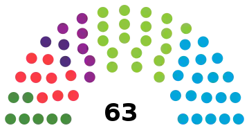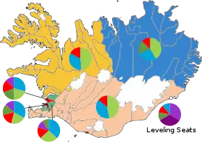There are six constituencies in Iceland. According to the Law on Parliamentary Elections (nr.24/2000), each constituency is allocated 9 seats decided by proportional voting, with 9 special leveling seats (either 1 or 2 per constituency, depending on population size) adjusting the result so that proportionality is maintained according to the overall number of votes received by a party at the national level. The number of constituency seats will, however, be adjusted ahead of the next election, if the number of residents with suffrage per available seat in the constituency increases to more than twice as many as in the last election, when comparing the constituency with the highest number against the one with the lowest. In that case a constituency seat will be reassigned from the constituency with the lowest number to the one with the highest, until the rule is met. However, the total number of seats (including leveling seats) may never fall to less than six in any constituency.[16][17] The box below shows the number of seats available in each constituency at the 2013 parliamentary election.[18]