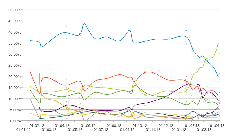 ![]() Graph of polls from January 2012. Stars stand for national surveys, when many surveys were taken within a four-day period, the average is taken and the line follows the average. |