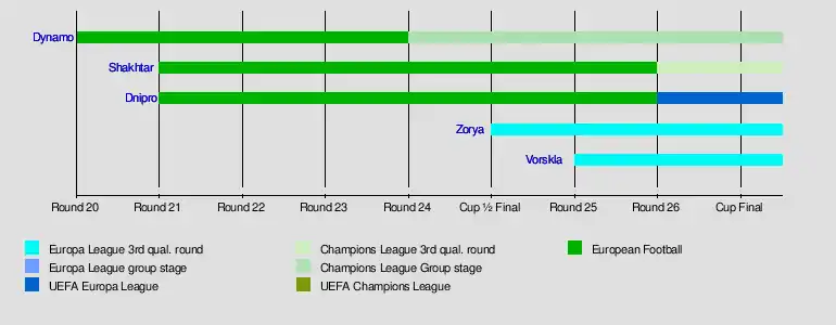 - After the 21st Round, both Dnipro Dnipropetrovsk and Shakhtar Donetsk qualified for European football for the 2015–16 season.[26]