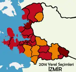 The İzmir mayoral elections of 2014 were held on 30 March 2014 as part of the nationwide local elections held on the same day. Mayors for the metropolitan municipality of İzmir and 30 other district municipalities throughout the İzmir Province were elected during the election, as well as municipal councillors for each district. The incumbent Aziz Kocaoğlu from the Republican People's Party (CHP) was re-elected as the metropolitan mayor of İzmir with 49.6% of the vote.