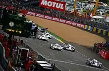 The 2014 Le Mans schedule was moved forward one week to avoid conflicts with other major motorsports series.[1] It was the 82nd running of the event,[2] and the third of eight scheduled rounds of the 2014 FIA World Endurance Championship.[3] Before the race Toyota drivers Anthony Davidson, Sébastien Buemi and Nicolas Lapierre led the Drivers' Championship with 50 points, 16 ahead of their teammates Alexander Wurz, Stéphane Sarrazin and Kazuki Nakajima and a further 16 in front of Loïc Duval, Lucas di Grassi and Tom Kristensen. Mathias Beche, Nicolas Prost and Nick Heidfeld were fourth on 18 points and Timo Bernhard, Brendon Hartley and Mark Webber stood in fifth place with 15.5 points.[4] Toyota were leading the Manufacturers' Championship with 84 points, 48 ahead of their rival Porsche in second; the third-placed Manufacturer Audi had scored 28 points.[4] Toyota had so far dominated the championship, winning the season's previous two races. Wurz, Sarrazin and Nakajima along with Duval, di Grassi and Kristensen had finished in second once and Bernhard, Hartley, Webber along with Wurz, Sarrazin and Nakajima had both secured third-place podium finishes.[4]