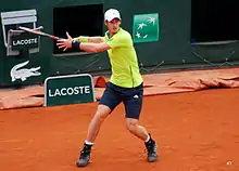 Murray began his French Open with a four sets win over Andrey Golubev,[35] and then defeated Marinko Matosevic to set up a third round match with Philipp Kohlschreiber.[36] The 28th seeded German proved a much tougher prospect and after Murray failed to see out the match from a commanding position in the fourth set, play was abandoned due to bad light at 7–7 in the deciding fifth set.[37] Despite having never been beyond 7–5 in a decider, Murray held his nerve to take it 12–10 when play resumed the following day.[38] He then returned the next day to take on Fernando Verdasco, but this match proved less troublesome with Murray picking up the win in straight sets.[39] In the quarter-finals, Murray played childhood friend Gaël Monfils and stormed into a two set lead. Monfils hit back though, winning the next two to take it to a decider. Despite the momentum seeming to be against Murray, he turned the match round spectacularly to take the final set 6–0 and reach the semi-finals, equalling his best ever result at the French Open. The result saw him become only the 10th man to reach multiple semi-finals at all four Grand Slams and also reach a British-record 14th Grand Slam semi-final.[40] In the semi-finals he faced Rafael Nadal for the second consecutive tournament. Nadal was at his best throughout the match and Murray struggled to keep up, weakened by the two long, five-set matches he had already played. In the end, Nadal saw off Murray in under two hours, winning comfortably in straight sets.[41]
